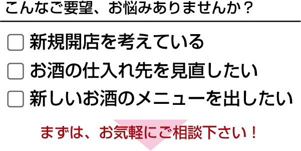 業務店用のお酒、飲料、食品の仕入れ先をお探しの方、仕入先の見直しをご検討の方は、お気軽にお問い合わせ下さい。